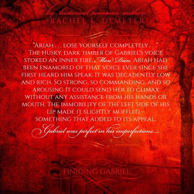 Gabriel released Ariah’s chin and tore away the bandage in a harsh movement. As his eyes bore into her own, pale moonlight fell upon the deformity, illuminating the twisted flesh and grotesque welts. The sight reminded her of a beautiful chateau . . . a stunning fortress situated along the coastline . . . one that had fallen into ruin and neglect. The skin was concave, destroyed, cavernous – a remnant of former glory. And the surrounding features – his burning eyes, the right side of his face, his powerful body – dwarfed the disfigurement with a striking beauty.