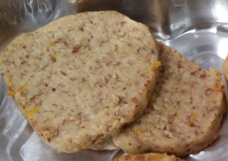 In a medium sized mixing bowl combine Almond Meal, Flour, Salt, Baking Soda and Cinnamon. In a separate small mixing bowl mix together Honey, Vanilla, and butter. Pour wet ingredients into bowl with the flour mixture, mix thoroughly (dough should be soft but not sticky, if it’s too sticky you can add up to 1/4 cup more flour) mix orange zest into dough.